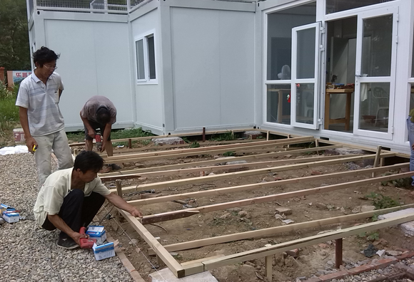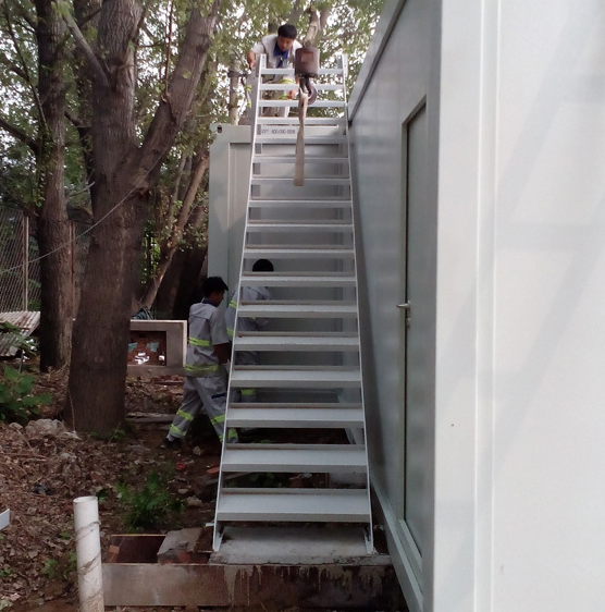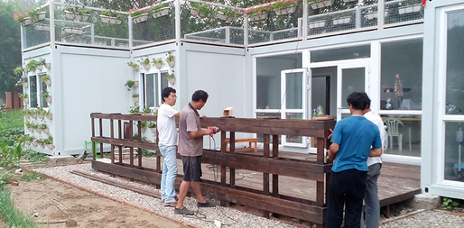 考查产品、沟通签约、出厂验收、运输到位、起吊、安装6个模块,装楼梯,完成组装。