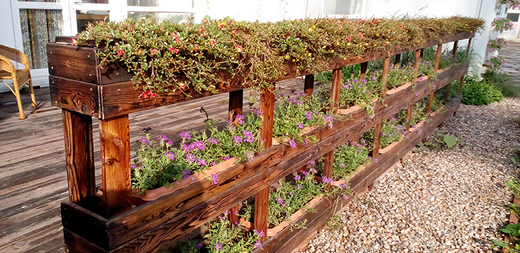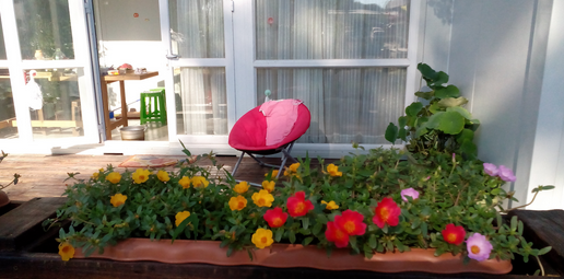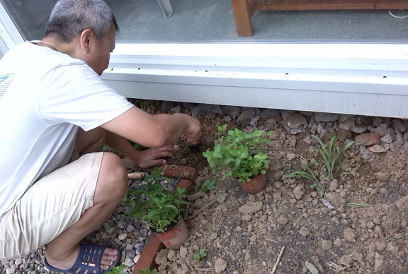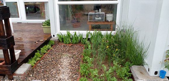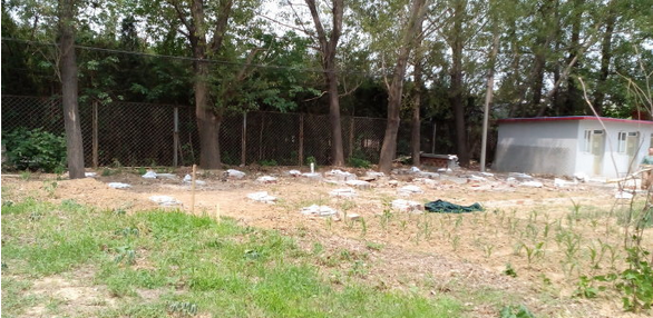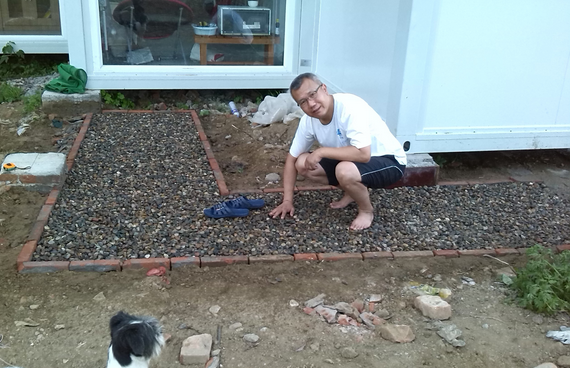 开始垒地板基、修小路、播种、挂花、挂架,朋友一起帮忙,经50天的努力,终成一派田园风光。