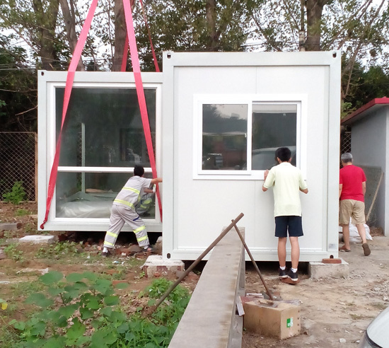 由六个白色铁皮集装箱模块拼接而成,造价30万。一个箱14.7平方米,6个箱大约90平,加上前后院不地板和绿化占地约200平米。