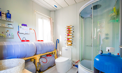 2.洗手间的马桶边有四个大桶,其中一个是灰水筒,一个用来收集灰水处理后得到的中水(中水可冲厕所或灌溉),另外两个桶是两级发酵的沼气桶。