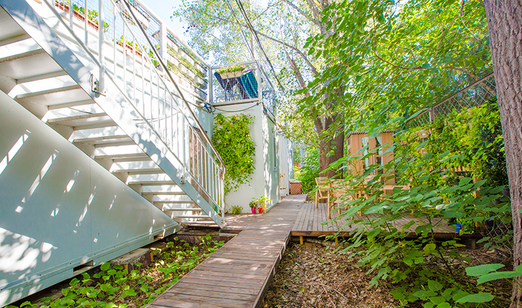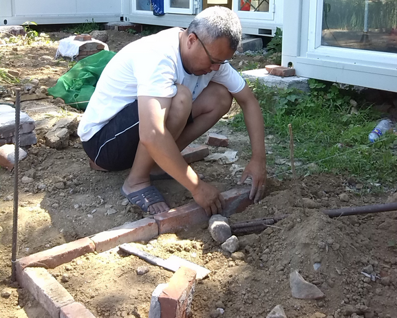 用旧砖、旧安全网、打地基余下的石子,建起生态小路,晒不热、透气、雨水下渗,草可以长、小虫能住,建筑垃圾利用,低成本的步道。