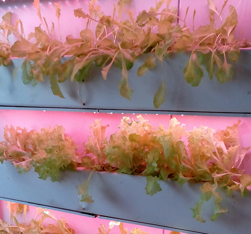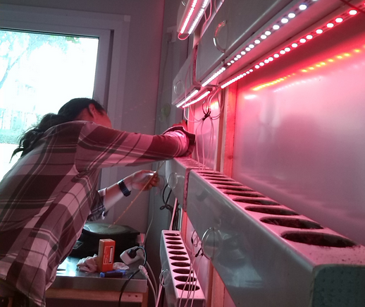LED植物生长灯照片,室内厨房墙壁立体菜园。雨水管制生长管、木龙骨,安生长管、加土、组装生长灯、播种、发芽、成长。