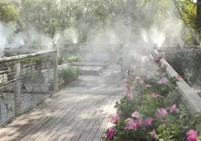 屋顶花园绿植采用微喷技术灌溉,远远看去,如在仙境。